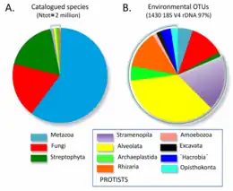 - 1 2 3 4 5 6 7 Singer, David; Seppey, Christophe V.W.; Lentendu, Guillaume; Dunthorn, Micah; Bass, David; Belbahri, Lassâad; Blandenier, Quentin; Debroas, Didier; de Groot, G. Arjen; de Vargas, Colomban; Domaizon, Isabelle; Duckert, Clément; Izaguirre, Irina; Koenig, Isabelle; Mataloni, Gabriela; Schiaffino, M. Romina; Mitchell, Edward A.D.; Geisen, Stefan; Lara, Enrique (January 2021). "Protist taxonomic and functional diversity in soil, freshwater and marine ecosystems". Environment International. 146 (106262): 106262. doi:10.1016/j.envint.2020.106262. hdl:10261/265020. PMID 33221595.
