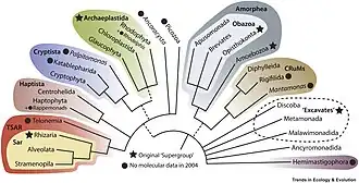 - ↑ Adl SM, Simpson AG, Farmer MA, Andersen RA, Anderson OR, Barta JR, Bowser SS, Brugerolle G, Fensome RA, Fredericq S, James TY, Karpov S, Kugrens P, Krug J, Lane CE, Lewis LA, Lodge J, Lynn DH, Mann DG, McCourt RM, Mendoza L, Moestrup O, Mozley-Standridge SE, Nerad TA, Shearer CA, Smirnov AV, Spiegel FW, Taylor MF (2005). "The new higher level classification of eukaryotes with emphasis on the taxonomy of protists". The Journal of Eukaryotic Microbiology. 52 (5): 399–451. doi:10.1111/j.1550-7408.2005.00053.x. PMID 16248873. S2CID 8060916.