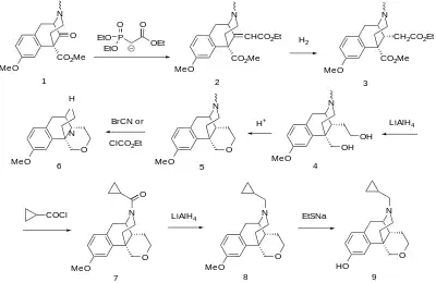 Starting material for this preparation is ketoester 1, available by one of the classical benzomorphan syntheses.[7] Condensation with the ylide from Triethyl phosphonoacetate (HWE reaction) affords diester 2. Catalytic hydrogenation proceeds from the less hindered face to afford the corresponding saturated diester (3). The esters are then reduced by means of LiAlH4 to give the glycol (4); this undergoes internal ether formation on treatment with acid to form the pyran ring of 5. Von Braun reaction with BrCN (or ethyl chloroformate) followed by saponification of the intermediate leads to the 2° amine (6). This is converted to the cyclopropylmethyl derivative 8 by acylation with cyclopropylcarbonyl chloride[8][9] followed by reduction of the thus formed amide (7) with LiAlH4. Cleaving off the O-methyl ether with sodium ethanethiol affords proxorphan (9).