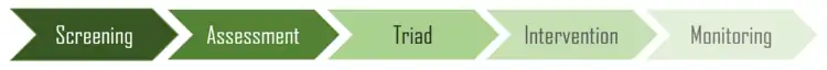 Patients and their caregivers are proactively screened for distress at regular intervals and (optimally) every medical visit, as early detection is essential for avoidance of severe distress symptoms.[18] Frequency of screening increases with the stage of the disease, as the risk of distress increases with severity of disease symptoms.[17] Positively assessed patients are triaged to optimal interventions, while their clinical contacts and referrals are tracked by the health institution to ensure treatment is received.[19] These targeted referrals are made towards optimal evidence-based treatments based on the patient's specific psychosocial symptoms and individual factors, with adherence to the NCCN's 2020 guidelines.[20][18]