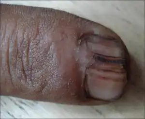Pterygium unguis (or dorsal pterygium[1]: 660 ) forms as a result of scarring between the proximal nailfold and matrix, with the classic example being lichen planus, though it has been reported to occur as a result of sarcoidosis and Hansen's disease.[2]