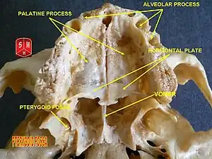 ![]() Sphenoid bone. Upper and posterior surfaces. (Pterygoid fossa labeled at left.) | |