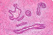 Early histological features expected to be seen on examination of gynecomastic tissue attained by fine-needle aspiration biopsy include the following: proliferation and lengthening of the ducts, an increase in connective tissue, an increase in inflammation and swelling surrounding the ducts, and an increase in fibroblasts in the connective tissue.[13] Chronic gynecomastia may show different histological features such as increased connective tissue fibrosis, an increase in the number of ducts, less inflammation than in the acute stage of gynecomastia, increased subareolar fat, and hyalinization of the stroma.[12][13] When surgery is performed, the gland is routinely sent to the lab to confirm the presence of gynecomastia and to check for tumors under a microscope. The utility of pathologic examination of breast tissue removed from male adolescent gynecomastia patients has recently been questioned due to the rarity of breast cancer in this population.[37]