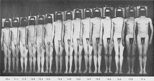 In males, testicular enlargement is the first physical manifestation of puberty (and is termed gonadarche).[29] Testes in prepubertal males change little in size from about 1 year of age to the onset of puberty, averaging about 2–3 cm in length and about 1.5–2 cm in width. The size of the testicles is among the parameters of the Tanner scale for male genitals, from stage I which represents a volume of less than 1.5 ml, to stage V which represents a testicular volume of greater than or equal to 20 ml. Testicular size reaches maximal adult size about 6 years after the onset of puberty. While 18–20 cm3 is an average adult size, there is wide variation in testicular size in the normal population.[30] After the male's testicles have enlarged and developed for about one year, the length and then the breadth of the shaft of the penis will increase and the glans penis and corpora cavernosa will also start to enlarge to adult proportions.[31]