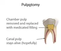 Pulpotomy is a minimally invasive procedure performed in children on a primary tooth with extensive caries but without evidence of root pathology.[1] The minimally invasive endodontic techniques of vital pulp therapy (VPT) are based on improved understanding of the capacity of pulp (nerve) tissues to heal and regenerate plus the availability of advanced endodontic materials. During the caries removal, this results in a carious or mechanical pulp exposure (bleeding) from the cavity. During pulpotomy, the inflamed/diseased pulp tissue is removed from the coronal pulp chamber of the tooth leaving healthy pulp tissue which is dressed with a long-term clinically successful medicament that maintains the survival of the pulp and promotes repair.[2] There are various types of medicament placed above the vital pulp such as Buckley's Solution of formocresol, ferric sulfate, calcium hydroxide or mineral trioxide aggregate (MTA).[1] MTA is a more recent material used for pulpotomies with a high rate of success, better than formocresol or ferric sulfate. It is also recommended to be the preferred pulpotomy agent in the future.[3][4] After the coronal pulp chamber is filled, the tooth is restored with a filling material that seals the tooth from microleakage, such as a stainless steel crown which is the most effective long-term restoration. However, if there is sufficient remaining supporting tooth structure, other filling materials such as amalgam or composite resin can provide a functional alternative when the primary tooth has a life span of two years or less.[1] The medium- to long-term treatment outcomes of pulpotomy in symptomatic permanent teeth with caries, especially in young people, indicate that pulpotomy can be a potential alternative to root canal therapy (RCT).[5]