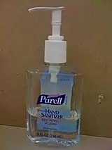 Purell is an American brand of hand sanitizer invented in 1988, and introduced to the consumer market in 1997, by GOJO Industries.[1] Its primary component is ethyl alcohol (70% v/v), and is used by wetting one's hands thoroughly with the product, then briskly rubbing one's hands together until dry.