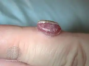 A pyogenic granuloma is a small, fragile bump that bleeds easily on the slightest injury.[1][3] It generally occurs on parts of the body that are injured more frequently such as hands, face, and forearms, typically in children.[1] The inside of the mouth and gums are a frequent site for the lesion in pregnancy.[1]