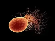 Pyrococcus furiosus is a strictly anaerobic, heterotrophic, sulfur-reducing archaea originally isolated from heated sediments in Vulcano, Italy by Fiala and Stetter. It is noted for its rapid doubling time of 37 minutes under optimal conditions, meaning that every 37 minutes the number of individual organisms is multiplied by two, yielding an exponential growth curve. Each organism is surrounded by a cellular envelope composed of glycoprotein called an S-layer. It appears as mostly regular cocci—meaning that it is roughly spherical—of 0.8 µm to 1.5 µm diameter with monopolar polytrichous flagellation.[1]