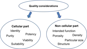 Careful and detailed documentation concerning the characteristics of the starting materials (e.g. history of the cell line derivation and cell banking) and manufacturing process steps (e.g. procurement of tissue or cells and manipulation) must be maintained. The cellular part of every cell-based medicinal product must be characterized in terms of identity, purity, potency, viability and suitability for the intended use. The non-cellular constituents must be also characterized with regards to their intended function in the final product. For example, scaffolds or membranes that are used to support the cells must be identified and characterized in terms of porosity, density, microscopic structure and particular size. The same requirement for characterization applies for biologically active molecules, such as growth factors or cytokines.[5]