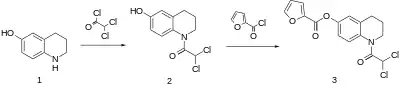 The synthesis begins by amidation of 6-hydroxytetrahydroquinoline with dichloroacetyl chloride. The sequence is completed by acylation with 2-furoyl chloride.