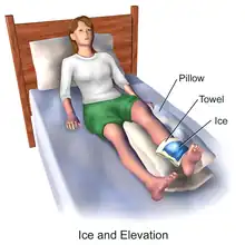 RICE is a mnemonic acronym for the four elements of a treatment regimen that was once recommended for soft tissue injuries: rest, ice, compression, and elevation.[1] It was considered a first-aid treatment rather than a cure and aimed to control inflammation.[2] It was thought that the reduction in pain and swelling that occurred as a result of decreased inflammation helped with healing.[1] The protocol was often used to treat sprains, strains, cuts, bruises, and other similar injuries.[3] Ice has been used for injuries since at least the 1960s, in a case where a 12-year-old boy needed to have a limb reattached. The limb was preserved before surgery by using ice. As news of the successful operation spread, the use of ice to treat acute injuries became common.[4]