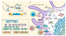 Liposome-encapsulated mRNA encoding a viral antigen was shown in 1993 to stimulate T cells in mice.[25][26] The following year self-amplifying mRNA was developed by including both a viral antigen and replicase encoding gene.[25][27] The method was used in mice to elicit both a humoral and cellular immune response against a viral pathogen.[25] The next year mRNA encoding a tumor antigen was shown to elicit a similar immune response against cancer cells in mice.[28][29]