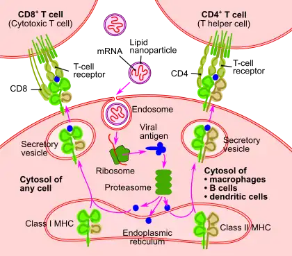 An mRNA vaccine is a type of vaccine that uses a copy of a molecule called messenger RNA (mRNA) to produce an immune response.[1] The vaccine delivers molecules of antigen-encoding mRNA into immune cells, which use the designed mRNA as a blueprint to build foreign protein that would normally be produced by a pathogen (such as a virus) or by a cancer cell. These protein molecules stimulate an adaptive immune response that teaches the body to identify and destroy the corresponding pathogen or cancer cells.[1] The mRNA is delivered by a co-formulation of the RNA encapsulated in lipid nanoparticles that protect the RNA strands and help their absorption into the cells.[2][3]