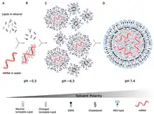 The first time the FDA approved the use of lipid nanoparticles as a drug delivery system was in 2018, when the agency approved the first siRNA drug, Onpattro.[68] Encapsulating the mRNA molecule in lipid nanoparticles was a critical breakthrough for producing viable mRNA vaccines, solving a number of key technical barriers in delivering the mRNA molecule into the host cell.[68][69] Research into using lipids to deliver siRNA to cells became a foundation for similar research into using lipids to deliver mRNA.[70] However, new lipids had to be invented to encapsulate mRNA strands, which are much longer than siRNA strands.[70]