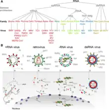 As of May 2020, all known RNA viruses encoding an RNA-directed RNA polymerase are believed to form a monophyletic group, known as the realm Riboviria.[4] The majority of such RNA viruses fall into the kingdom Orthornavirae and the rest have a positioning not yet defined.[5] The realm does not contain all RNA viruses: Deltavirus, Asunviroidae, and Pospiviroidae are taxa of RNA viruses that were mistakenly included in 2019,[lower-alpha 1] but corrected in 2020.[6]