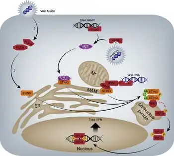 - ↑ Maringer, Kevin; Fernandez-Sesma, Ana (December 2014). "Message in a bottle: lessons learned from antagonism of STING signalling during RNA virus infection". Cytokine & Growth Factor Reviews. 25 (6): 669–679. doi:10.1016/j.cytogfr.2014.08.004. ISSN 1879-0305. Retrieved 1 June 2023.