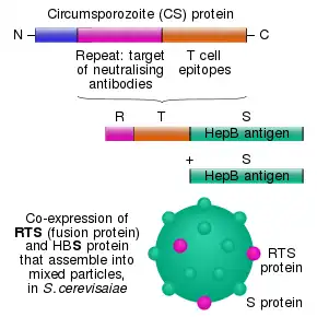 The RTS,S vaccine is based on a protein construct first developed by GlaxoSmithKline in 1986. It was named RTS because it was engineered using genes from the repeat ('R') and T-cell epitope ('T') of the pre-erythrocytic circumsporozoite protein (CSP) of the Plasmodium falciparum malaria parasite together with a viral surface antigen ('S') of the hepatitis B virus (HBsAg).[9] This protein was then mixed with additional HBsAg to improve purification, hence the extra "S".[9] Together, these two protein components assemble into soluble virus-like particles similar to the outer shell of a hepatitis B virus.[23]