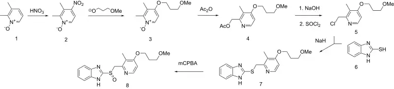 The above synthesis pathway begins with 2,3-dimethypyridine N-oxide (1). Nitration of 2,3-dimethylpyridine N-oxide affords the nitro derivative (the addition of NO2) (2) The newly introduced nitro group is then displaced by the alkoxide from 3-methoxypropanol to yield the corresponding ether (3). Treatment with acetic anhydride results in the Polonovski reaction. Saponification followed by treatment with thionyl chloride then chlorinates the primary alcohol (5). Reaction with benzimidazole-2-thiol (6) followed by oxidation of the resulting thioether to the sulfoxide yields the final product: rabeprazole (8).[26][27]