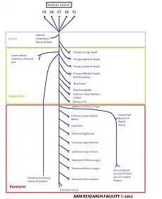 The radial nerve originates as a terminal branch of the posterior cord of the brachial plexus.[1] It goes through the arm, first in the posterior compartment of the arm, and later in the anterior compartment of the arm, and continues in the posterior compartment of the forearm.