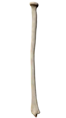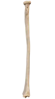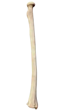 The radius or radial bone (pl.: radii or radiuses) is one of the two large bones of the forearm, the other being the ulna. It extends from the lateral side of the elbow to the thumb side of the wrist and runs parallel to the ulna. The ulna is longer than the radius, but the radius is thicker. The radius is a long bone, prism-shaped and slightly curved longitudinally.
