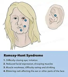 Symptoms include acute facial nerve paralysis, pain in the ear, taste loss in the front two-thirds of the tongue, dry mouth and eyes, and an red small blistering rash[5] in the ear canal, tongue, or mouth.[2] About 8% of cases do not have any blisters.[2]