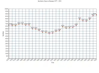 The prevalence of rape in Germany has remained relatively stable, and although the country has the second highest overall number of rapes reported in the EU, the number of reports per capita is average for the region.[2][3] As of 1995 the recorded incidence of rape in Germany was 7.57 per 100,000 people.[4] In 2009, about 7,314 rape cases were reported, a rate of 9 per 100,000 people.[5] In 2011, there were about 7,539 reported cases of rape.[6][5][lower-alpha 2]