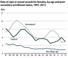 The National Violence Against Women Survey (NVAWS) stated that 300,000 women and 93,000 men were raped annually between November 1995 to May 1996.[9] Rape prevalence among women in the U.S. (the percentage of women who experienced rape at least once in their lifetime so far) is in the range of 15–20% according to different studies (National Violence against Women survey, 1995, found 17.6% prevalence rate;[10] a 2007 national study for the Department of Justice on rape found 18% prevalence rate.[11]). According to a March 2013 report from the U.S. Department of Justice's Bureau of Justice Statistics, from 1995 to 2010, the estimated annual rate of female rape or sexual assault declined 58%, from 5.0 victimizations per 1,000 females age 12 or older to 2.1 per 1,000. Assaults on young women aged 12–17 declined from 11.3 per 1,000 in 1994–1998 to 4.1 per 1,000 in 2005–2010; assaults on women aged 18–34 also declined over the same period, from 7.0 per 1,000 to 3.7.[12][13]