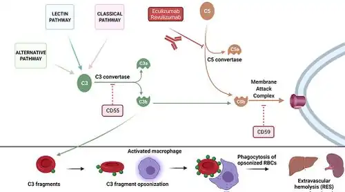 By attaching to the C5 protein, the medicine blocks its effect and thereby reduces the destruction of red blood cells.[3]