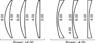 Although corrective lenses can be produced in many different profiles, the most common is ophthalmic or convex-concave. In an ophthalmic lens, both the front and back surfaces have a positive radius, resulting in a positive/convergent front surface and a negative/divergent back surface. The difference in curvature between the front and rear surface leads to the corrective power of the lens. In hyperopia a convergent lens is needed, therefore the convergent front surface overpowers the divergent back surface. For myopia the opposite is true: the divergent back surface is greater in magnitude than the convergent front surface. To correct for presbyopia, the lens, or section of the lens, must be more convergent or less divergent than the person's distance lens.
