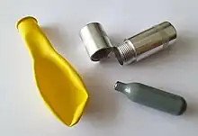 Recreational users generally use 8 gram (¼ oz) containers of nitrous oxide "whippets", which they use to fill balloons or whipped cream dispensers. The gas is then inhaled from the balloon or dispenser.[24] This is necessary because nitrous oxide is very cold when it undergoes adiabatic decompression on exit from a canister; inhalation directly from a tank is dangerous and can cause frostbite of the larynx and bronchi.[25]