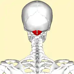 ![]() Human skull seen from back (rectus capitis posterior minor shown in red.) | |