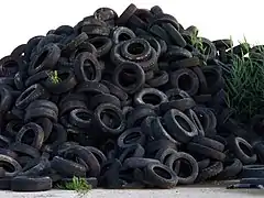 Because tires are highly durable and non-biodegradable, they can consume valuable space in landfills.[43] If waste tires are improperly managed they may cause rubber pollution. In 1990, it was estimated that over 1 billion scrap tires were in stockpiles in the United States. As of 2015, only 67 million tires remain in stockpiles.[44] From 1994 to 2010, the European Union increased the amount of tires recycled from 25% of annual discards to nearly 95%, with roughly half of the end-of-life tires used for energy, mostly in cement manufacturing.[45][46]