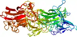 Reelin is composed of 3461 amino acids with a relative molecular mass of 388 kDa. It also has serine protease activity.[46] Murine RELN gene consists of 65 exons spanning approximately 450 kb.[47] One exon, coding for only two amino acids near the protein's C-terminus, undergoes alternative splicing, but the exact functional impact of this is unknown.[28] Two transcription initiation sites and two polyadenylation sites are identified in the gene structure.[47]