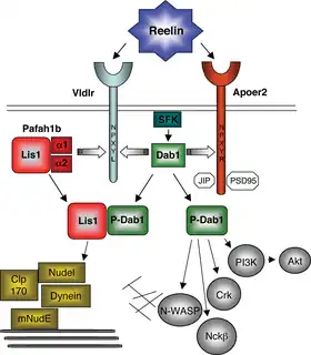 A protein having an important role in lissencephaly and accordingly called LIS1 (PAFAH1B1), was shown to interact with the intracellular segment of VLDLR, thus reacting to the activation of reelin pathway.[77]