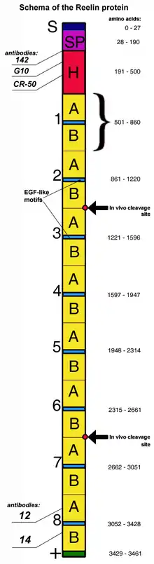 The reelin protein starts with a signaling peptide 27 amino acids in length, followed by a region bearing similarity to F-spondin (the reeler domain), marked as "SP" on the scheme, and by a region unique to reelin, marked as "H". Next comes 8 repeats of 300–350 amino acids. These are called reelin repeats and have an epidermal growth factor motif at their center, dividing each repeat into two subrepeats, A (the BNR/Asp-box repeat) and B (the EGF-like domain). Despite this interruption, the two subdomains make direct contact, resulting in a compact overall structure.[48]