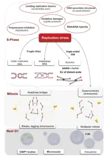 The events that lead to genome instability occur in the cell cycle prior to mitosis, specifically in the S phase. Disturbance to this phase can generate negative effects, such as inaccurate chromosomal segregation, for the upcoming mitotic phase.[9] The two processes that are responsible for damage to the S phase are oncogenic activation and tumor suppressor inactivation. They have both been shown to speed up the transition from the G1 phase to the S phase, leading to inadequate amounts of DNA replication components. These losses can contribute to the DNA damage response (DDR). Replication stress can be an indicative characteristic for carcinogenesis, which typically lacks DNA repair systems.[14][15] A physiologically short duration of the G1 phase is also typical of fast replicating progenitors during early embryonic development.[16]