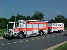 A rescue vehicle is a specialised vehicle designed to transport and provide the equipment necessary for technical rescue.[1] Vehicles carry an array of special equipment such as the jaws of life, wooden cribbing, generators, winches, hi-lift jacks, cranes, cutting torches, circular saws and other forms of heavy equipment unavailable on standard trucks. This capability differentiates them from traditional pumper trucks or ladder trucks designed primarily to carry firefighters and their entry gear as well as on-board water tanks, hoses and equipment for fire extinguishing and light rescue. Most rescue vehicles lack on-board water tanks and pumping gear, owing to their specialized role. A rescue vehicle is typically operated by a rescue squad, but in some areas it may be integrated with emergency medical services or fire departments.