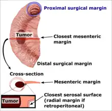 A resection margin or surgical margin is the margin of apparently non-tumorous tissue around a tumor that has been surgically removed, called "resected", in surgical oncology. The resection is an attempt to remove a cancer tumor so that no portion of the malignant growth extends past the edges or margin of the removed tumor and surrounding tissue. These are retained after the surgery and examined microscopically by a pathologist to see if the margin is indeed free from tumor cells (called "negative"). If cancerous cells are found at the edges (called "positive") the operation is much less likely to achieve the desired results.[1]: sections 1-2