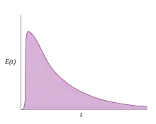 This method required the introduction of a very small volume of concentrated tracer at the inlet of the reactor, such that it approaches the Dirac delta function.[10][8] Although an infinitely short injection cannot be produced, it can be made much smaller than the mean residence time of the vessel. If a mass of tracer, , is introduced into a vessel of volume and an expected residence time of , the resulting curve of can be transformed into a dimensionless residence time distribution curve by the following relation: