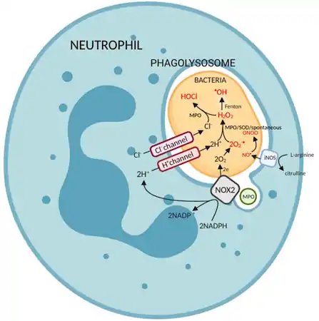 9. Hampton MB, Kettle AJ, Winterbourn CC (November 1998). "Inside the neutrophil phagosome: oxidants, myeloperoxidase, and bacterial killing". Blood. 92 (9): 3007–17. doi:10.1182/blood.V92.9.3007.421k47_3007_3017. PMID 9787133. S2CID 45991444.