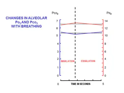 The volume of air that moves in or out (at the nose or mouth) during a single breathing cycle is called the tidal volume. In a resting adult human it is about 500 ml per breath. At the end of exhalation the airways contain about 150 ml of alveolar air which is the first air that is breathed back into the alveoli during inhalation.[10][20] This volume air that is breathed out of the alveoli and back in again is known as dead space ventilation, which has the consequence that of the 500 ml breathed into the alveoli with each breath only 350 ml (500 ml - 150 ml = 350 ml) is fresh warm and moistened air.[6] Since this 350 ml of fresh air is thoroughly mixed and diluted by the air that remains in the alveoli after normal exhalation (i.e. the functional residual capacity of about 2.5–3.0 liters), it is clear that the composition of the alveolar air changes very little during the breathing cycle (see Fig. 9). The oxygen tension (or partial pressure) remains close to 13-14 kPa (about 100 mm Hg), and that of carbon dioxide very close to 5.3 kPa (or 40 mm Hg). This contrasts with composition of the dry outside air at sea level, where the partial pressure of oxygen is 21 kPa (or 160 mm Hg) and that of carbon dioxide 0.04 kPa (or 0.3 mmHg).[6]