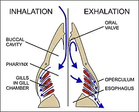 Water is drawn in through the mouth by closing the operculum (gill cover), and enlarging the mouth cavity (Fig. 23). Simultaneously the gill chambers enlarge, producing a lower pressure there than in the mouth causing water to flow over the gills.[58] The mouth cavity then contracts inducing the closure of the passive oral valves, thereby preventing the back-flow of water from the mouth (Fig. 23).[58][65] The water in the mouth is, instead, forced over the gills, while the gill chambers contract emptying the water they contain through the opercular openings (Fig. 23). Back-flow into the gill chamber during the inhalatory phase is prevented by a membrane along the ventroposterior border of the operculum (diagram on the left in Fig. 23). Thus the mouth cavity and gill chambers act alternately as suction pump and pressure pump to maintain a steady flow of water over the gills in one direction.[58] Since the blood in the lamellar capillaries flows in the opposite direction to that of the water, the consequent countercurrent flow of blood and water maintains steep concentration gradients for oxygen and carbon dioxide along the entire length of each capillary (lower diagram in Fig. 22). Oxygen is, therefore, able to continually diffuse down its gradient into the blood, and the carbon dioxide down its gradient into the water.[57] Although countercurrent exchange systems theoretically allow an almost complete transfer of a respiratory gas from one side of the exchanger to the other, in fish less than 80% of the oxygen in the water flowing over the gills is generally transferred to the blood.[56]