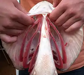 Fig. 21. The operculum or gill cover of a pike has been pulled open to expose the gill arches bearing filaments.