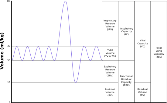 The lungs expand and contract during the breathing cycle, drawing air in and out of the lungs. The volume of air moved in or out of the lungs under normal resting circumstances (the resting tidal volume of about 500 ml), and volumes moved during maximally forced inhalation and maximally forced exhalation are measured in humans by spirometry.[12] A typical adult human spirogram with the names given to the various excursions in volume the lungs can undergo is illustrated below (Fig. 3):