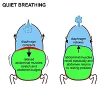 During exhalation the diaphragm and intercostal muscles relax. This returns the chest and abdomen to a position determined by their anatomical elasticity. This is the "resting mid-position" of the thorax and abdomen (Fig. 7) when the lungs contain their functional residual capacity of air (the light blue area in the right hand illustration of Fig. 7), which in the adult human has a volume of about 2.5–3.0 liters (Fig. 3).[6] Resting exhalation lasts about twice as long as inhalation because the diaphragm relaxes passively more gently than it contracts actively during inhalation.