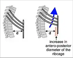 Fig. 4 The effect of the muscles of inhalation in expanding the rib cage. The particular action illustrated here is called the pump handle movement of the rib cage.