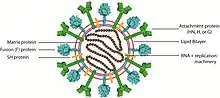Respirovirions are enveloped, with spherical geometries. The diameter is around 150 nm. Respirovirus genomes are linear, around 15kb in length. The genome codes for 8 proteins.[3][4]