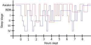 Sleep pattern of a person with restless legs syndrome (red) versus a healthy sleep pattern (blue) | |