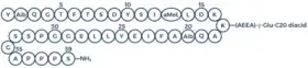 Retatrutide (LY-3437943) is an experimental drug for obesity developed by American pharmaceutical company Eli Lilly and Company. It is a triple hormone receptor agonist of GLP-1, GIP, and GCGR receptors.[1] It has been shown to achieve a more than 17.5% mean weight reduction in adults without diabetes but with obesity or preobesity (overweight) during a phase 2 trial.[2][3][4] The drug is a peptide with amino acid sequence YA1QGTFTSDYSIL2LDKK4AQA1AFIEYLLEGGPSSGAPPPS3.[5]