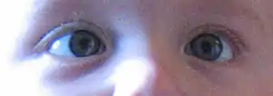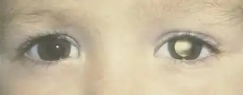 The most common and obvious sign of retinoblastoma is an abnormal appearance of the retina as viewed through the pupil, the medical term for which is leukocoria, also known as amaurotic cat's eye reflex.[8] Other signs and symptoms include deterioration of vision, a red and irritated eye with glaucoma, and faltering growth or delayed development. Some children with retinoblastoma can develop a squint,[9] commonly referred to as "cross-eyed" or "wall-eyed" (strabismus). Retinoblastoma presents with advanced disease in developing countries and eye enlargement is a common finding.